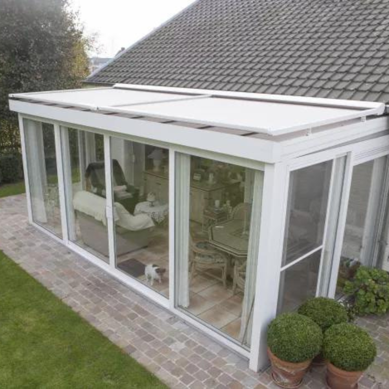 Comment profiter de la vue sur son jardin depuis sa véranda en plein été? Grâce à nos protections solaires pour vérandas qui maintiennent une température intérieure agrébale.